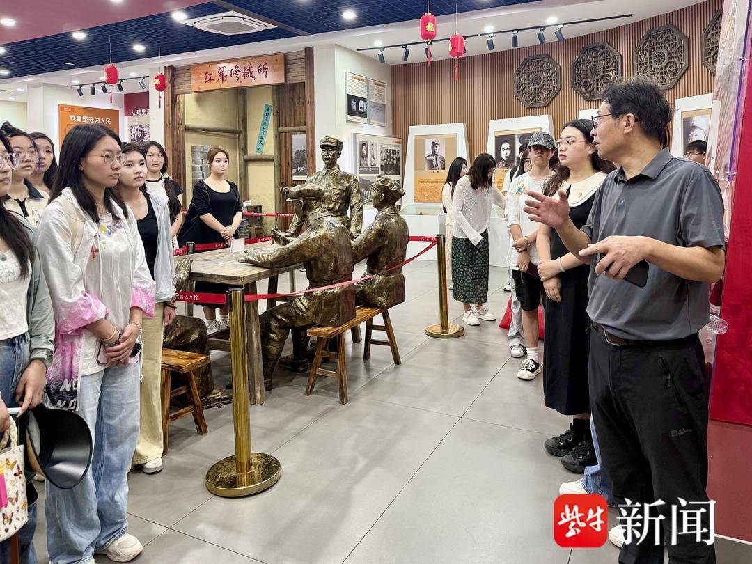在张军的带领下,师生代表重走新四军抗战路。步入陈毅旧居,斑驳的煤油灯在木桌上投下暖黄光晕,八仙桌面的裂痕中沉淀着岁月尘埃,墙角泛黄的《抗日宣言》手稿上,墨迹虽已褪色却依然铿锵有力。张军谈到:“这些文物不是冰冷的展品,而是会说话的历史见证者。”参观过程中,他鼓励学生在现场开展速写技能锻炼,并启发学生:“如何在创作过程中提炼建筑造型?”“怎样通过光影对比强化创作主旨?”这种“观察—思考—创作”的链条式教学,让学生们收获颇丰。