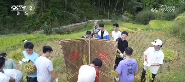 在收割现场,500多名中学生正在体验收割、打谷、脱粒等传统农耕过程,现场学习农耕知识,感受“汗滴禾下土”辛劳的同时,也领略了梯田赏秋的独特魅力。