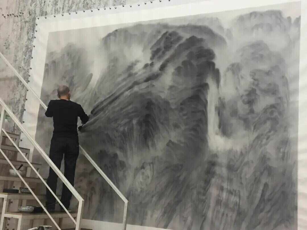 为解决这一难题,徐龙森不得不“从头来过”:研发适合巨幅创作的画笔、工具,探索新的绘画思路。他的画室墙壁就是一幅宽约20米、高约11米的山水巨作:近距离观赏时,画面偏抽象;退到一定距离后,整体结构便清晰显现。
