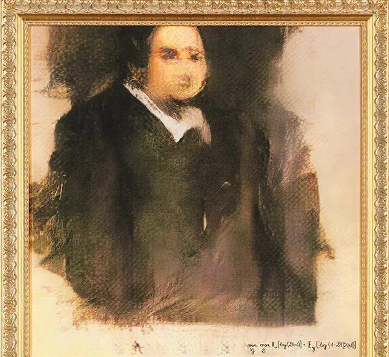 法国Obvious团队用生成对抗网络(GAN)训练模型,输入1.5万张14至20世纪的肖像画,最终输出了《埃德蒙·贝拉米肖像》。
