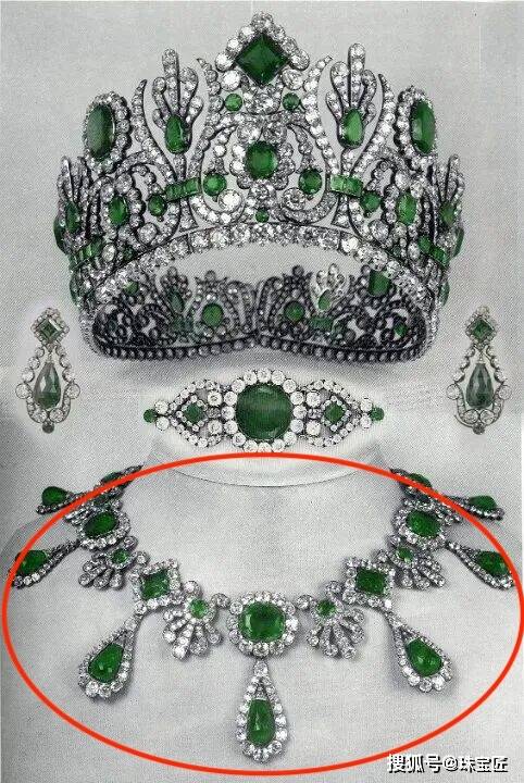 佳士得2019年拍卖了一条和玛丽路易斯皇后的祖母绿项链同时期,约1810年的祖母绿钻石流苏项链,最大的祖母绿约17ct,成交价为CHF 1,815,000(合人民币约1625万元)。