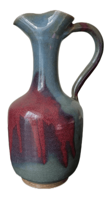 壶高31㎝,口径7㎝,底径10㎝。敞口,长颈,深腹,长流,弓形柄,圈足垫烧。器型庄重,胎质细腻,釉水肥厚,尤其大面积红斑难得。(量子年份检测北宋晚期)