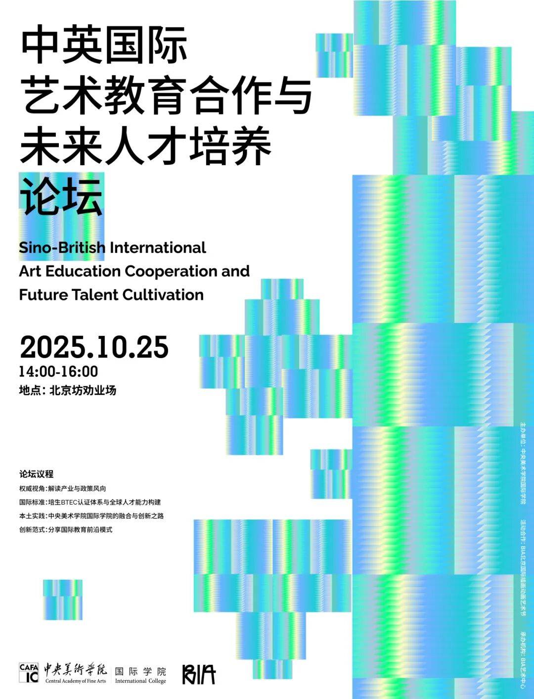 2025年10月25日,作为BIA北京国际插画动画艺术节的重要学术单元,由中央美术学院国际学院主办的中英国际艺术教育合作与未来人才培养论坛将于百年历史与现代气息交融的北京坊劝业场隆重启幕。本届论坛旨在搭建一个高规格、前瞻性的对话平台,汇聚中英两国权威机构与顶尖院校代表,共同探讨艺术教育的融合创新与未来人才的培养路径。