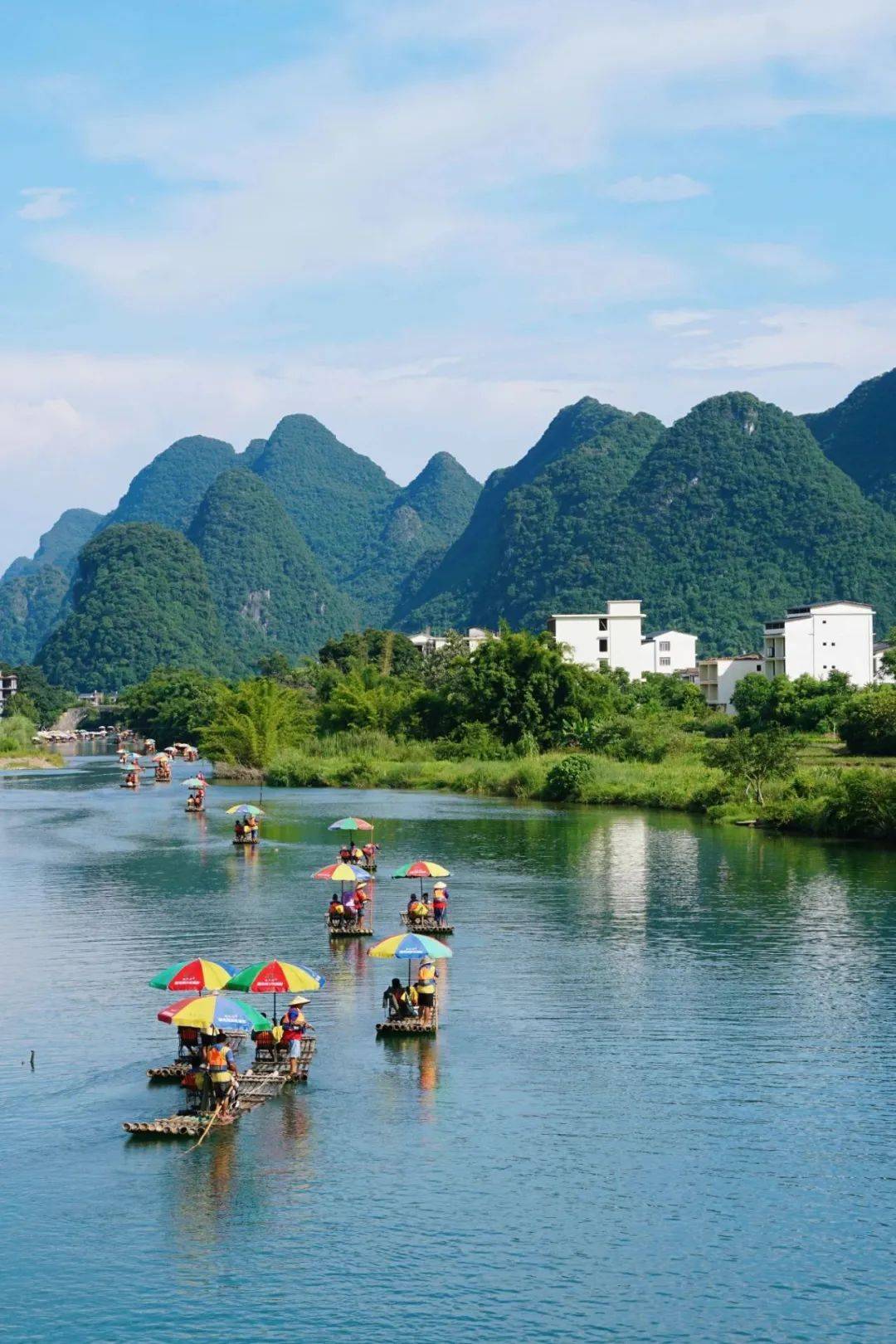 象鼻山作为桂林的城市标志,是大自然的鬼斧神工之作。游客乘坐竹筏顺着漓江缓缓漂流,两岸的青山不断向后退去,清风拂面,带来清新的水汽,仿佛置身于一幅流动的山水画卷之中。