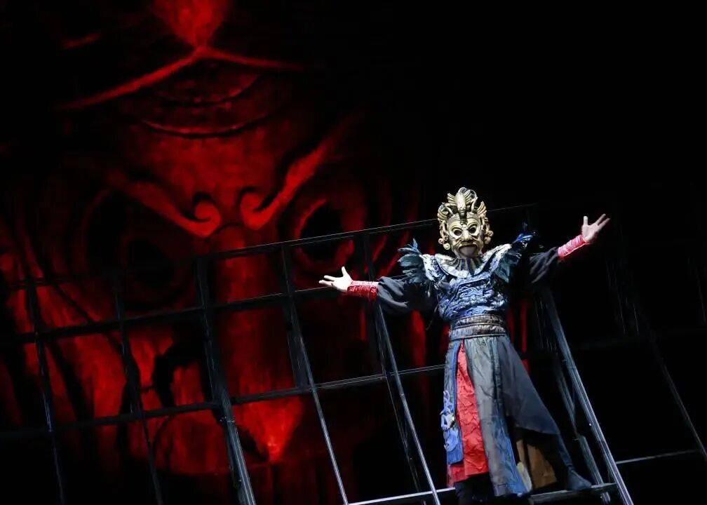 话剧《兰陵王》的历史背景设定在南北朝时期的北齐,这一时期是中国历史上政治动荡、民族融合与文化交融的重要阶段。演出场地选在虞山公园山剧场,悬挂的“铁笼式神武宫”与远处层峦叠嶂的山峰相映,巨幅红绸铺展时恰好接住山间晚霞,自然光影成为舞台最灵动的补光师。()