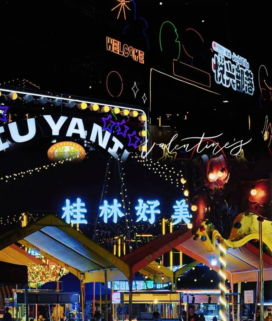 漓江歌剧院附近:观演前后可前往文化宫夜市。文化宫夜市是桂林夜晚的又一热闹去处,这里的小吃种类非常丰富,有热门小吃炒螺、种类繁多的烧烤等。在这里,能满足你对夜宵的各种需求。