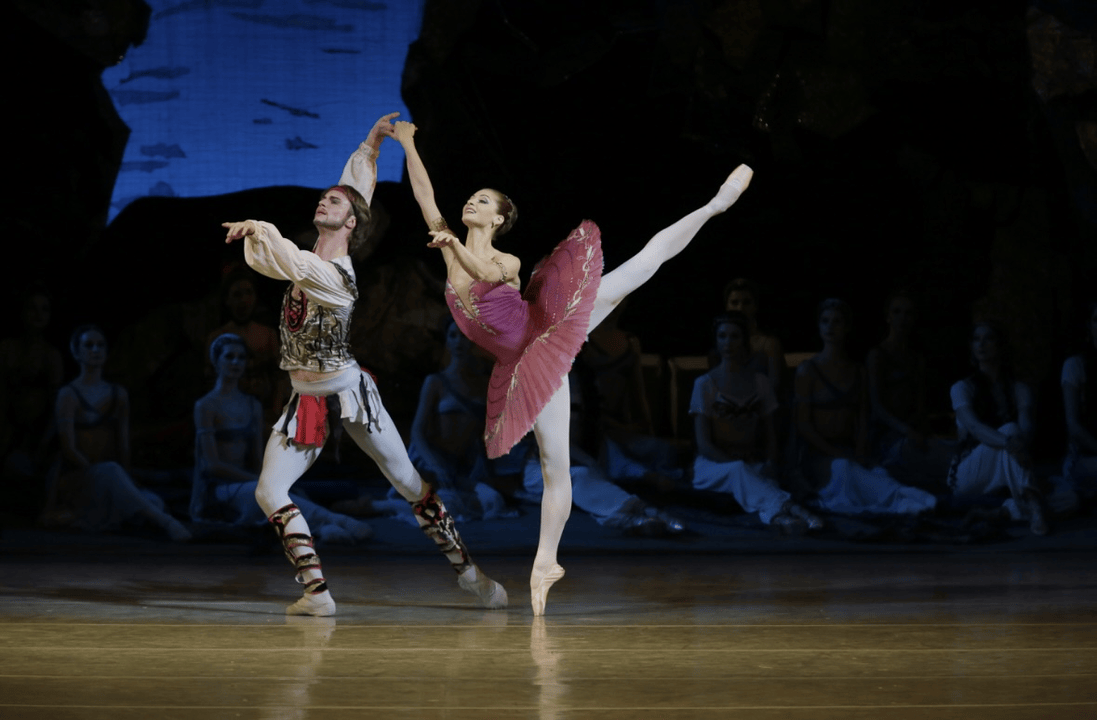 剧中最负盛名的,是作品第二幕,在海盗洞穴里的“三人舞”,堪称芭蕾技巧与戏剧张力并存的巅峰,是芭蕾舞从舞蹈到叙事的美学“可视化”案例。该舞段由男主康拉德和他的朋友阿里,以及女主米多拉共同呈现;而常演的“海盗双人舞”,是经努里耶夫改编,由“米多拉”和“阿里”演绎,不仅成为了世界各地芭蕾舞团主要的保留剧目,同时也是不同的国际芭蕾舞比赛中,参赛选手足尖的“常客”。
