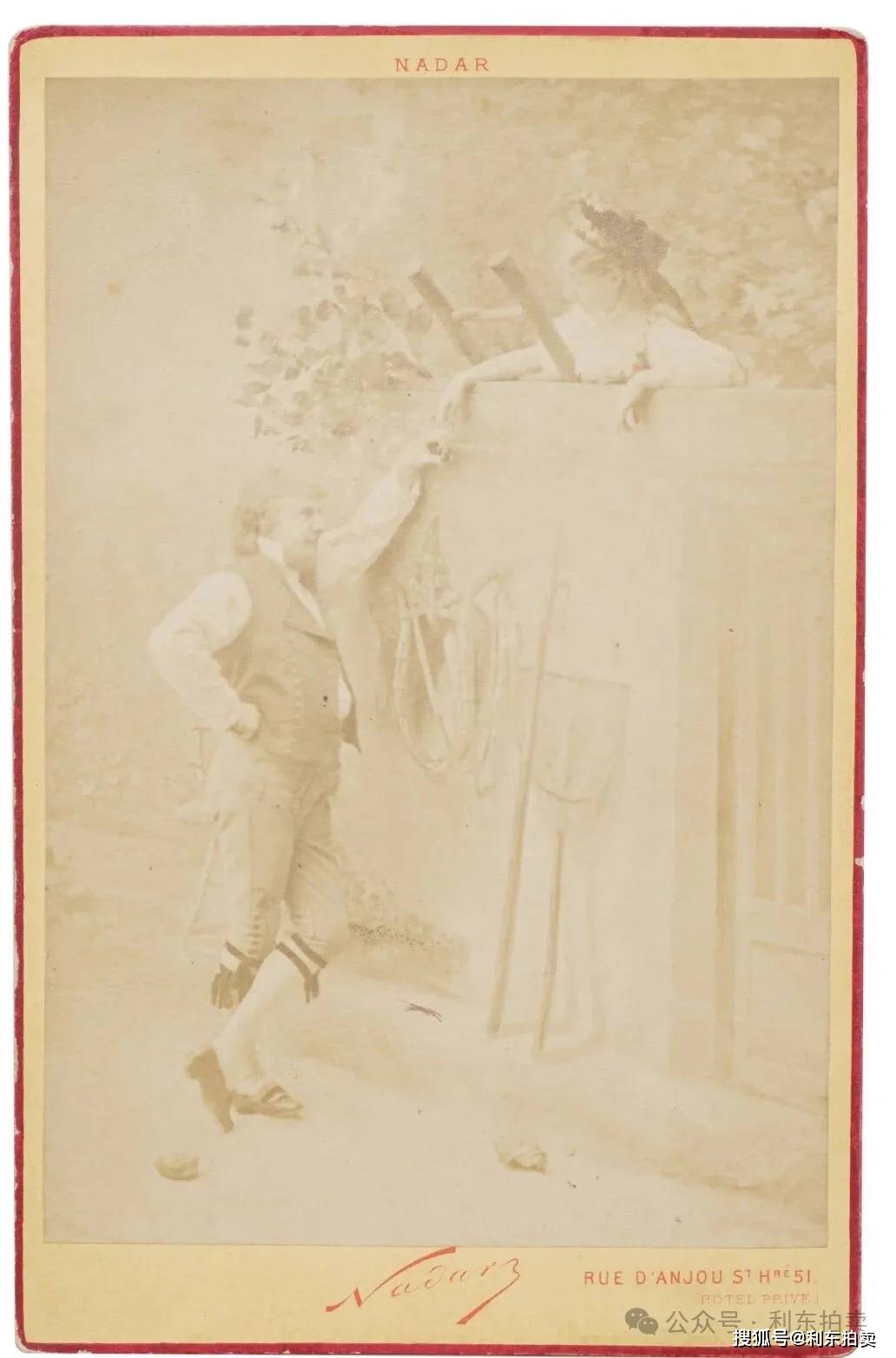 本作并非法式传统人物胸像,而是一幅颇具戏剧性的户外场景:衣着考究的绅士倚墙凝望,伸手与墙内一位风帽轻挽的淑女调笑。背景枝叶扶疏、梯架与园艺工具点缀,暗示私人庭院氛围;纳达尔以柔光蛋白印相捕捉暧昧瞬间,突显第三共和时期市民阶层的浪漫世态。此类“情景柜卡”产量远低于常见肖像,存世较稀。