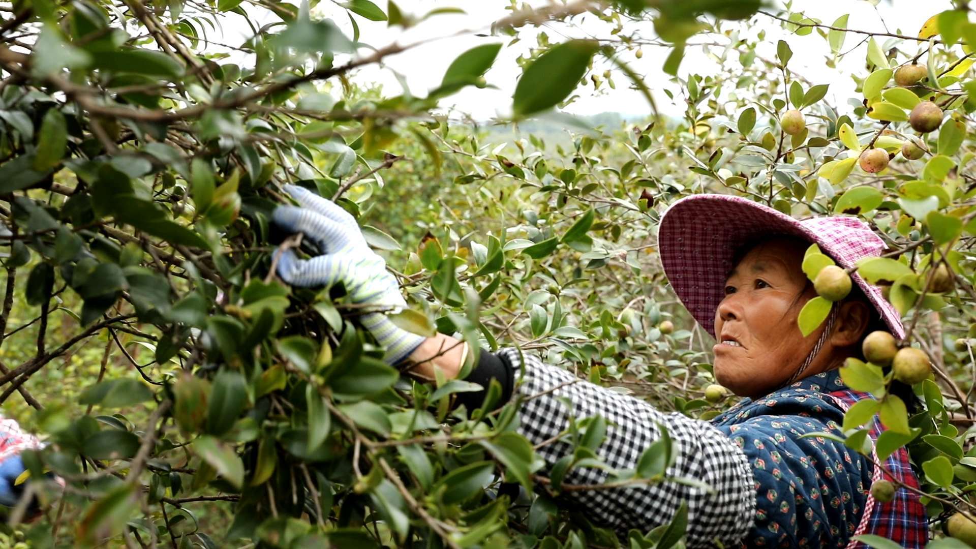 清晨6点,身背竹篓的村民们便已踏着露水上山,穿行于油茶林中,放眼望去,成片的油茶树枝繁叶茂,村民们手法娴熟地采摘着枝头饱满的油茶果,山野间一派繁忙景象。