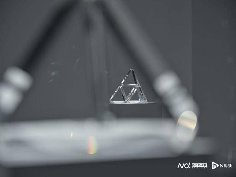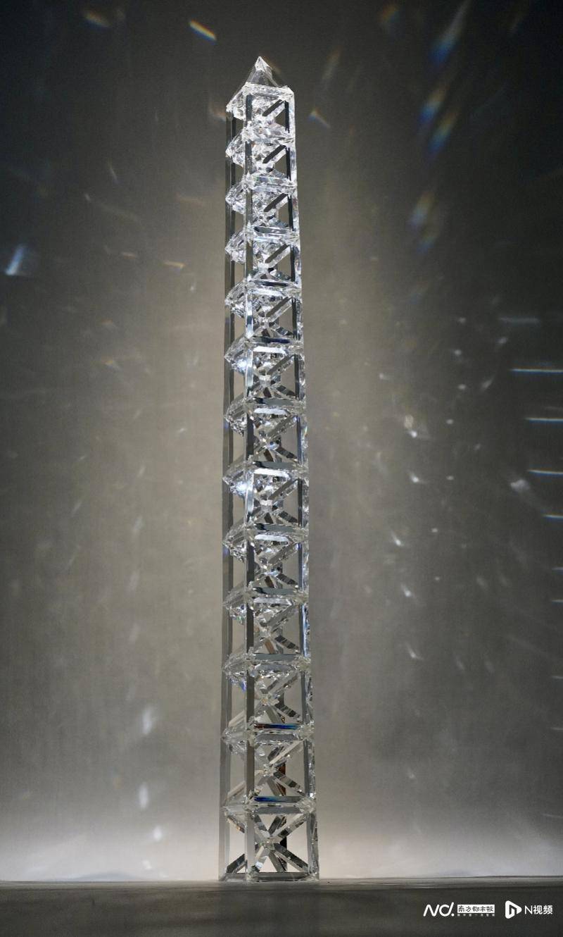 在《映》系列中,蔡志松展现了从宏大叙事向精微内观的形式蜕变,作品呈现出两种相辅相成的面向:比如作品 《天际》,那座11层镂空的锥形水晶塔,以其层层递进、指向“天际”的尖锐结构,在“简洁利落的几何感”中,蕴含着一种理性的秩序与精神的向上感。它通体“通透”,却又能在灯光下迸发出“填满整个空间的绚烂光彩”。这完美诠释了艺术家所追求的“坚实却轻盈,允许一切穿过,又自有璀璨光华”的生命状态。它既是物质的塔,更是精神的塔,象征着在历经层层修炼与提纯后,内心所能达到的既澄澈又光芒四射的境界。