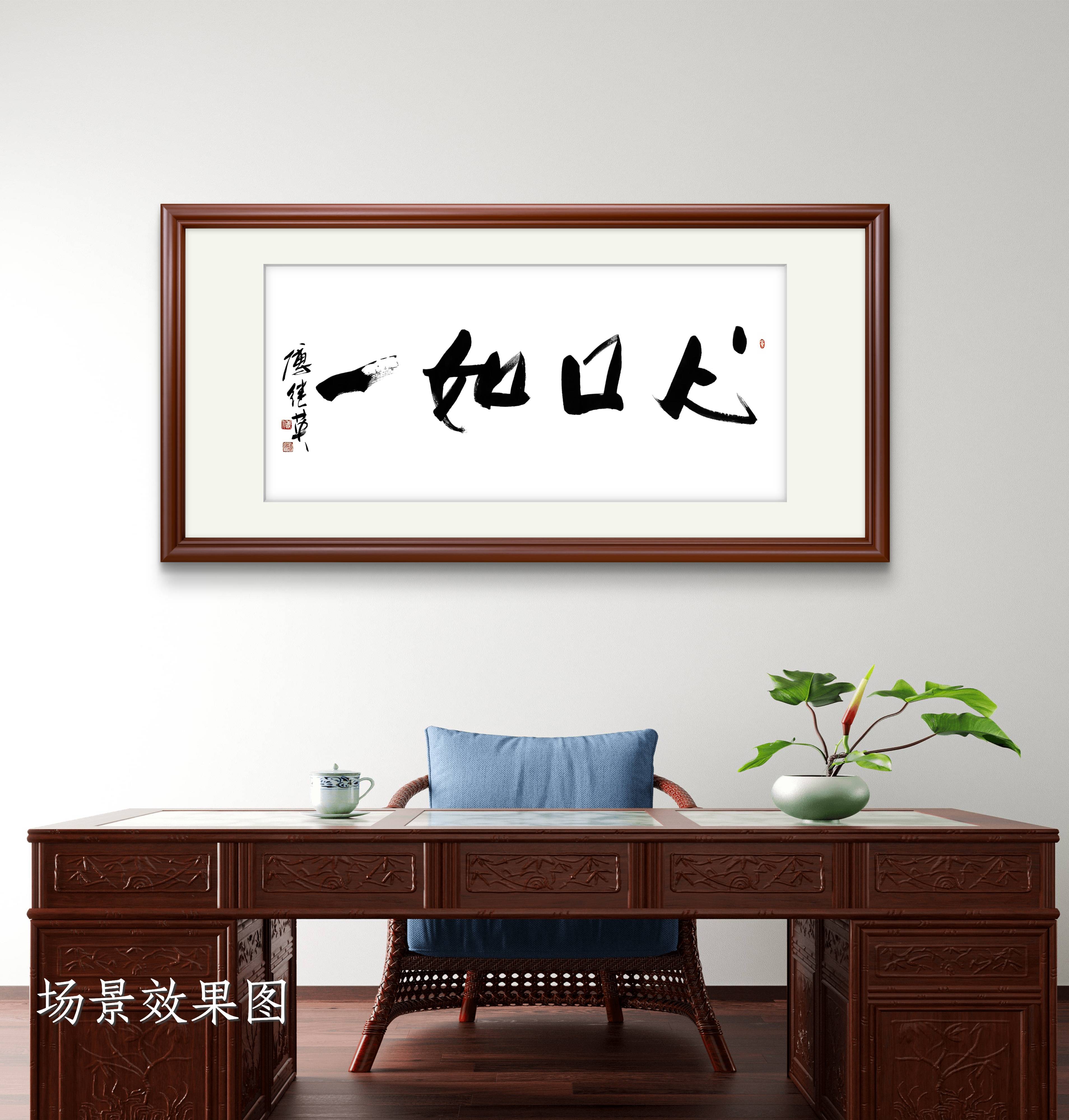 在办公室悬挂,更是为职场空间注入坚守的力量。职场中难免面临利益权衡与人情纠葛,“心口如一” 的书法如一盏明灯,提醒人们在工作中坚守原则、坦诚待人,不搞虚情假意的套路,不做违背本心的决策。它既能让使用者在忙碌中保持清醒,坚守职业操守,也能向同事与合作伙伴传递出可靠、可信的信号,为职场关系奠定真诚的基础,让工作氛围更显纯粹与高效。