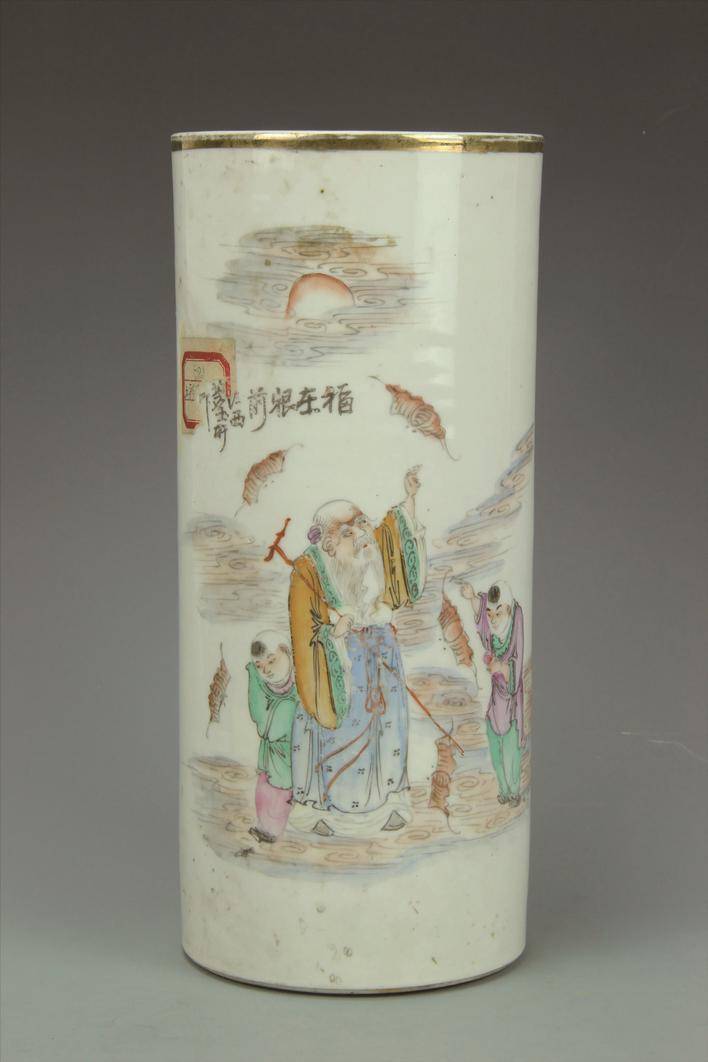 帽筒,俗称“官帽筒”,出现在清代嘉庆道光时期,是清代官员置放顶戴花翎的实用器。后来,这类瓷器从官窑走向民窑,发展成为居家摆设、女儿出嫁时的必备陪嫁品,用途也从实用器转变为观赏器,以其丰富的制作工艺、制式、绘画等,见证了一个半世纪的民风民俗。