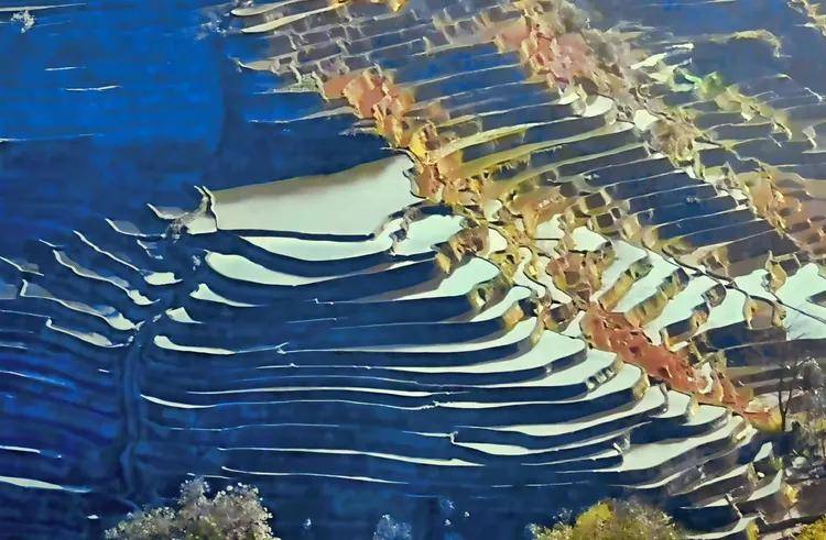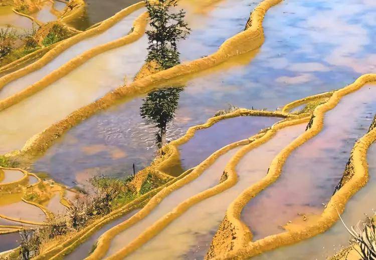 镜头拉近,元阳梯田的细节愈发清晰。金黄的田埂如精心勾勒的线条,圈出形态各异的水田。水色丰富,或映着蓝天泛出澄澈的蓝,或因泥土晕染出暖棕,一棵小树挺立其中,似是这大地艺术里灵动的注脚。