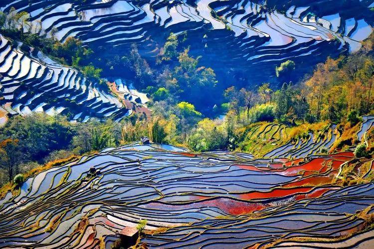 一阵微风吹过,梯田的水面泛起层层涟漪,那些丰富的色块也随之轻轻晃动、交融,像是一幅流动的油画。阳光在涟漪上跳跃,碎成无数闪亮的光点,宛如银河坠落人间,在梯田上肆意流淌。