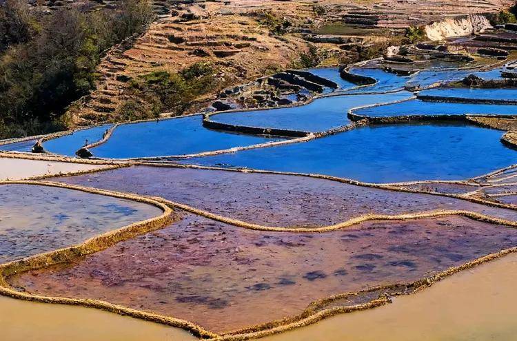还有的梯田,边缘残留着上一季水稻收割后留下的枯黄稻茬,与新灌的水色交织,黄与蓝、黄与红相互映衬,既有着时光更迭的痕迹,又透着一种新旧交替的生机。