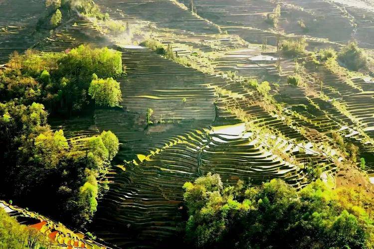 有的梯田,因为泥土的成分或是水中微生物的缘故,泛着温润的红褐。这红褐并非单调的一色,在阳光的轻抚下,又变幻出深浅不一的层次,像是大地的肌肤,带着生命的温度与质感,仿佛在诉说着这片土地的厚重与沧桑。