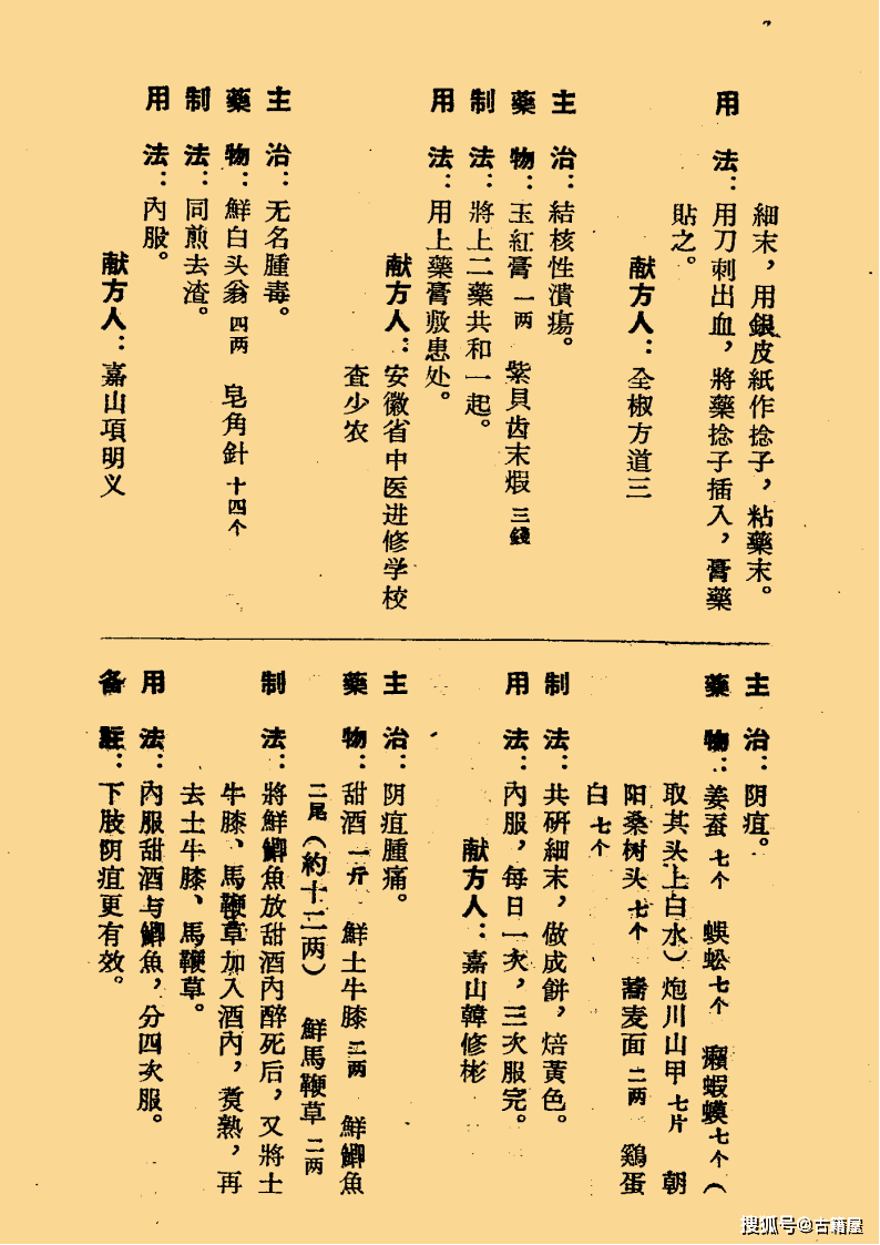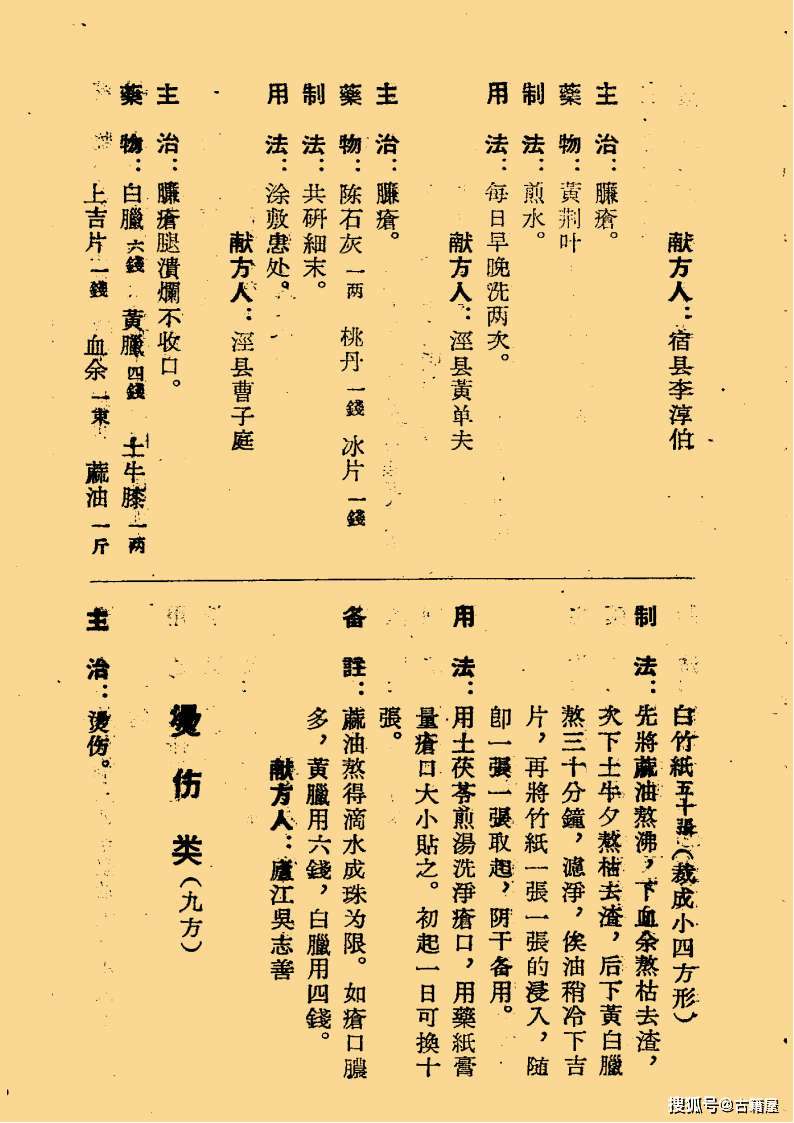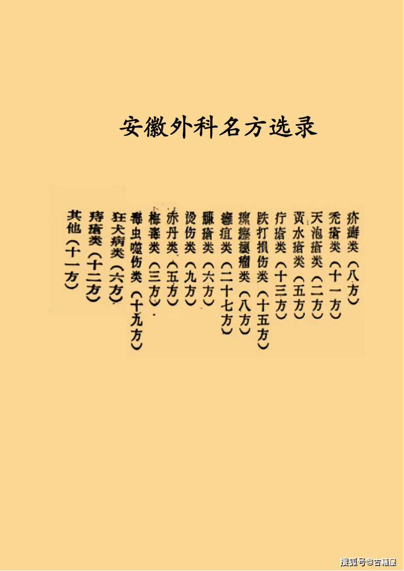中医外科书籍《安徽外科名方选录》页数: 40页 简介:《安徽外科名方选录》中医外科相关书籍。内容包含:疥癣类八方,秃疮类十一方,天泡疮类二方,黄水疮类五方,疔疮类十三方,跌打损伤类十五方,臁疮类六方,烫伤类九方,赤丹类五方,毒虫噬伤类十九方,痔疮类十二方等。