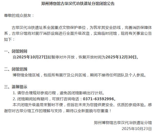 10月26日,记者从郑州博物馆获悉,为完善消防保障体系,古荥汉代冶铁遗址分馆决定自10月27日起实施临时闭馆,对展厅消防设施进行全面升级改造,12月30日恢复开放。期间所有展厅及公共区域,不接待任何团队及个人参观。