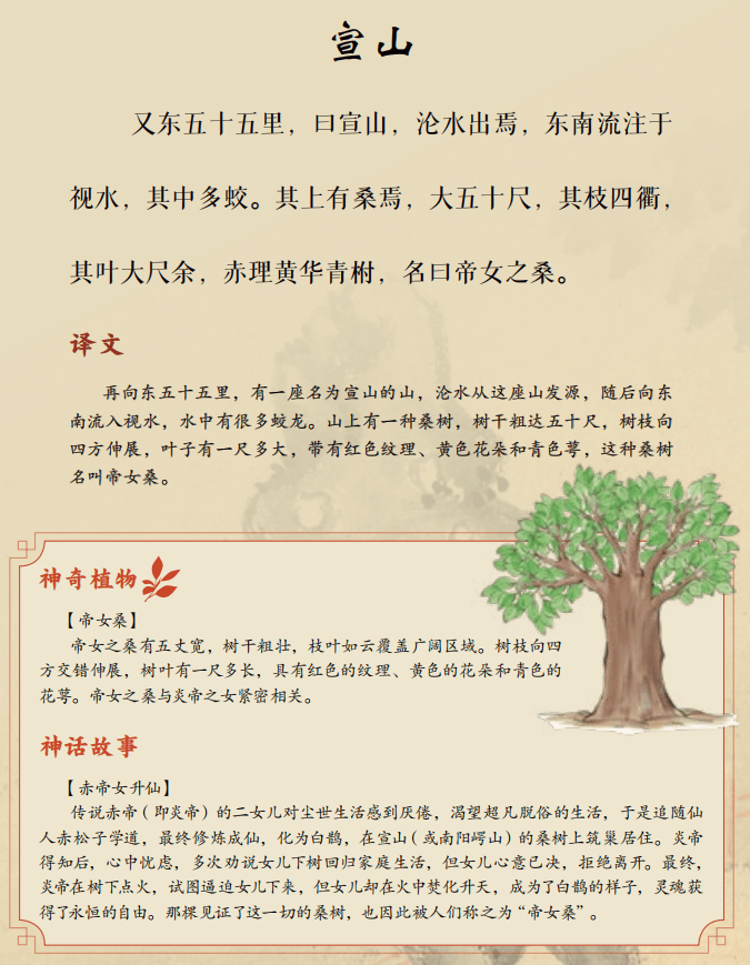 比如《山海经·中山经》中的“帝女之桑”,虽然原文介绍了它的特点,却没有解释为什么叫“帝女桑”这个奇怪的名字。