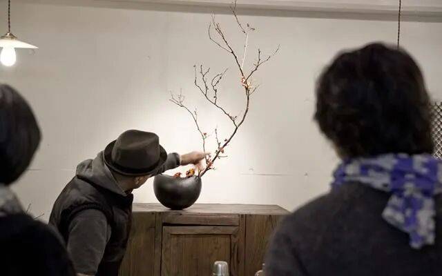 上野雄次坚信,大自然并不追求个体的完美,而是追求全体的和谐。因此落下的花朵、枯木、落叶,都是表达自然的一种美学形式。从野外带回的竹子躯干、枯木枝或者是台风过后被吹倒的笔筒树都可能成为上野雄次的插花器物。