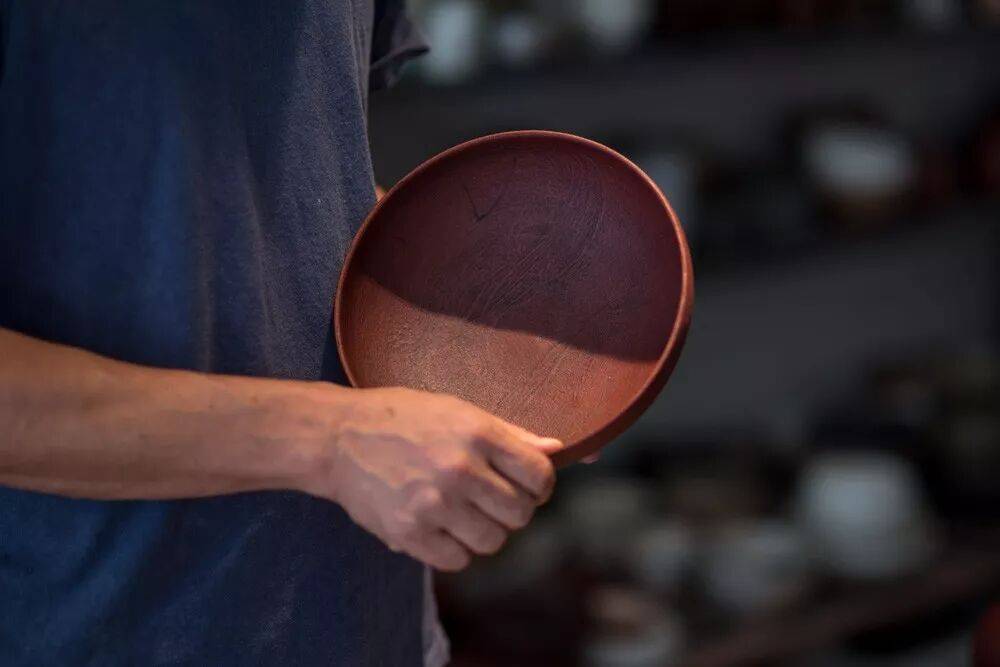 对于器物表面的质感更是依循着所使用陶土的特性,虽含不全然协调、平滑,造型也充满了不对称的状态,就像圆形的盘子并不是那么浑圆,表面的质感也不光华平顺,但是作品却像是从大自然中蕴蓄出来的。