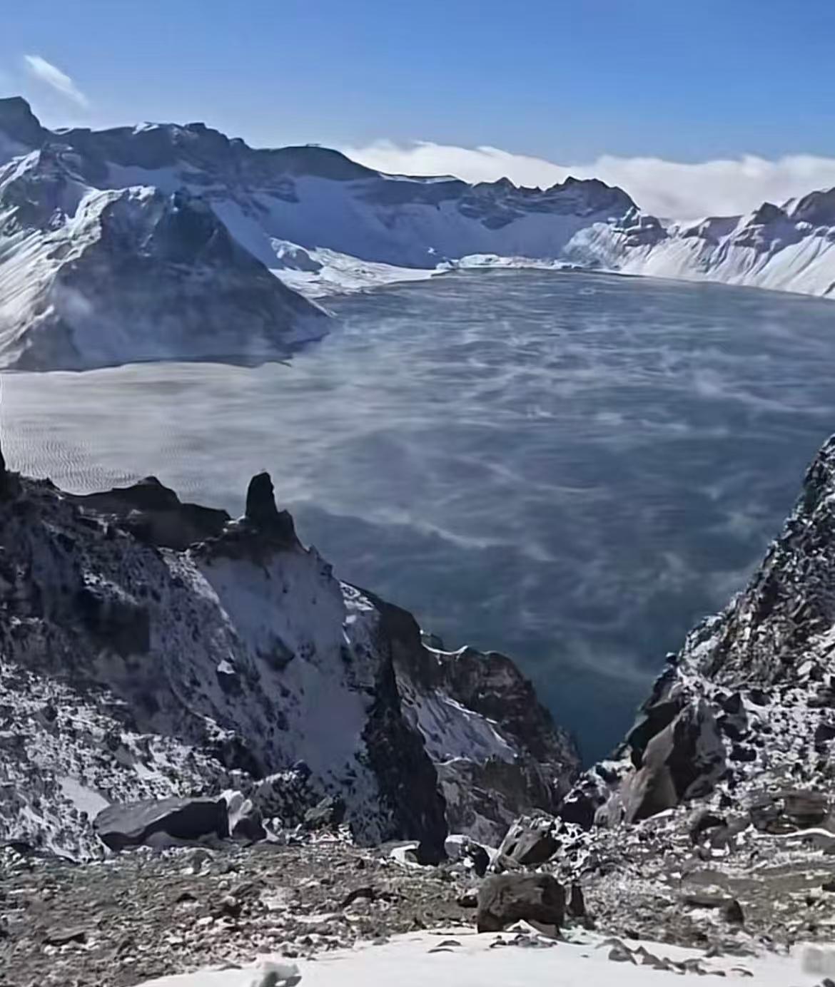 长白山景区的一位导游晚晚(化名)当天也目睹了“海浩”的奇观。10月20日上午9点左右,她跟随景区工作人员前往天池附近清理道路积雪,来到北坡一观景台处时,看到在大风吹拂下,凝结的水蒸气正贴着天池的水面扩散、飘动。
