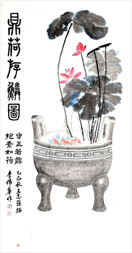 2023年,故宫博物院研究员、文物鉴定专家单国强先生观展“融通丝路 共享未来一带一路十年成果展”时,对李伟华老师的参展作品《西溪湿地》进行了肯定:画的西溪湿地,用的水墨还是比较恰当的,水份比较多的。什么样的景致要用什么样的笔墨渲染。这个湿地运用水墨渲染跟层层落点是比较合适的,这个用墨也受到黄宾虹水墨的影响。