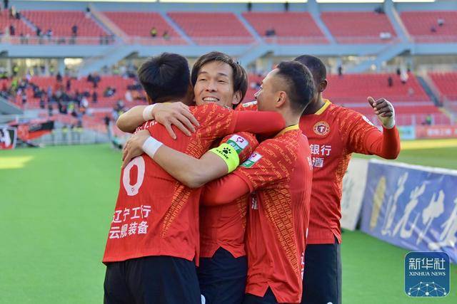 ↑ 辽宁铁人队球员邦本宜裕(左二)在进球后与队友庆祝。新华社记者 吴青昊 摄