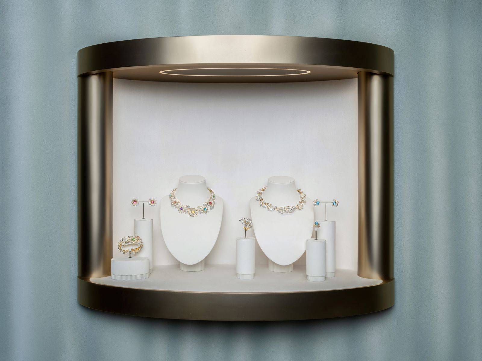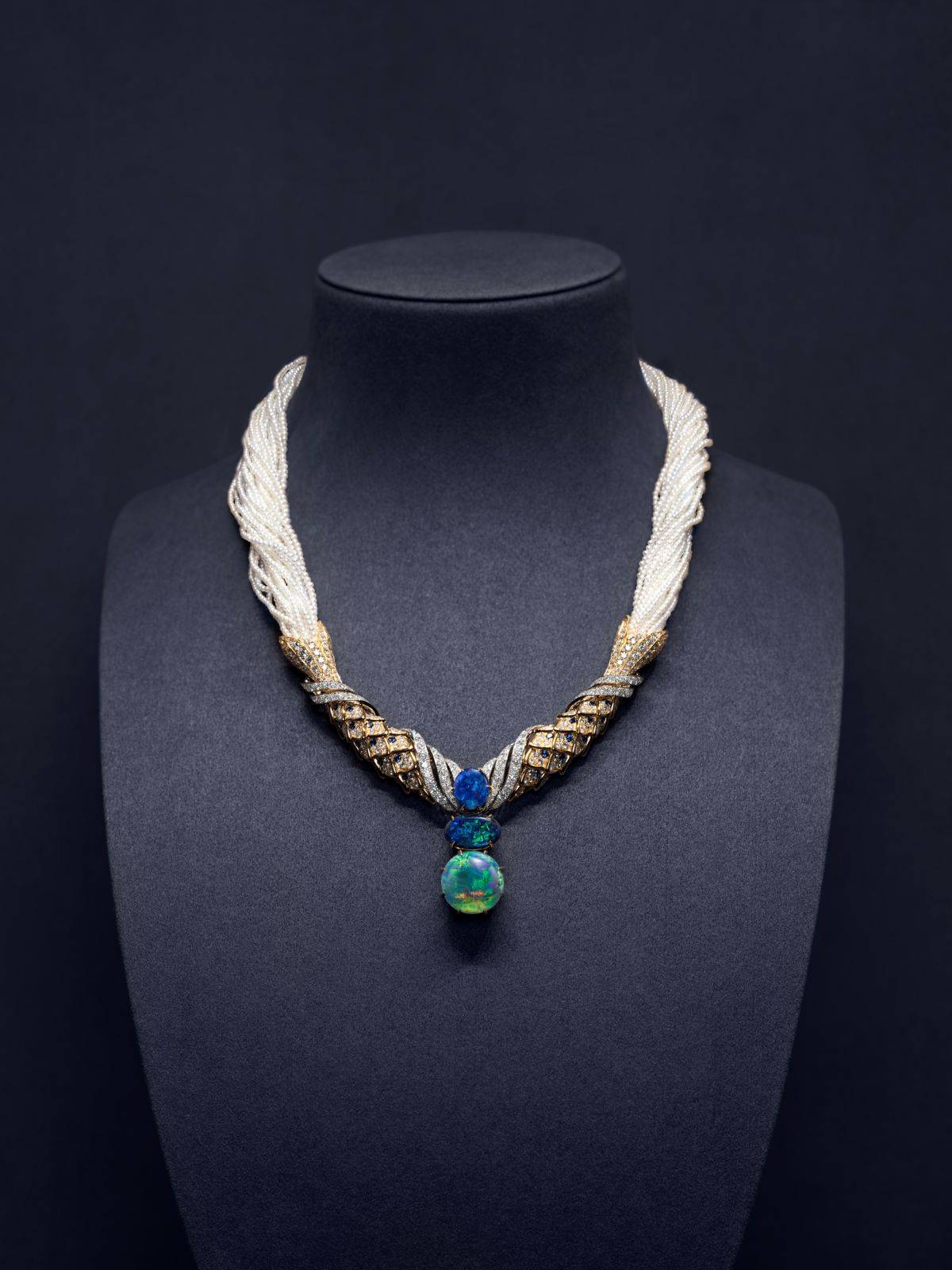 受该系列主题启发,2025 Blue Book高级珠宝系列Sea of Wonder瑰海奇珍作品悉数陈列于深蓝色调与波纹图案交织的空间之中。花舞海葵(Anemone)主题的灵感源自让·史隆伯杰一系列妙趣横生的海葵胸针设计,系列作品洋溢着灵动韵律与奇思妙想,其中一款项链更是在三颗未经优化处理红宝石的点缀下,尤为瞩目。瀚海星螺(Shell)主题以铂金、黄金勾勒蜿蜒起伏的曲线,钻石与黄钻镶嵌其间,再现贝壳自然“隆起”的形态,礼赞自然造物的形态与肌理之美。海灵仙姿(Mermaid)主题则探索美人鱼的韵味风姿,其中一款镶嵌黑色欧泊的项链更是以抽象手法展现美人鱼神秘而梦幻的魅力。每一件作品皆以珍罕宝石与非凡匠艺,焕新演绎让·史隆伯杰对海洋世界的绮丽创想。