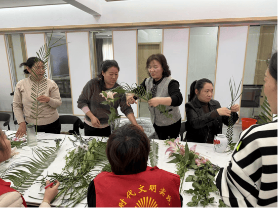 在演示环节,马老师一边操作、一边讲解,从选花、修剪到插入、调整,展现了插花创作的完整过程。在老师的指导下,居民们纷纷动手实践,或优雅构思,或巧妙搭配,不一会儿,一件件充满创意与生活气息的插花作品陆续完成。活动现场笑声与花香交织,温情与文化共融,大家互相欣赏、拍照留念,沉浸在艺术创作的喜悦中。一位居民表示:“平时忙于生活,今天第一次系统学习插花,才发现原来家里的花瓶也能成为艺术作品的载体。这样的活动让我们离文化更近,也让生活更美。”