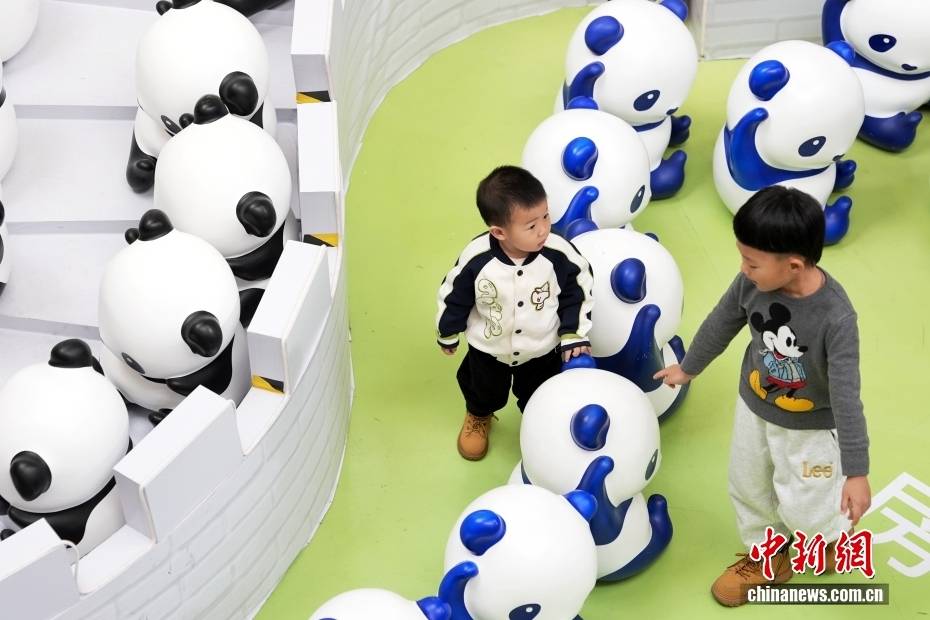 10月27日,正值第9个“国际熊猫日”,小朋友在北京国贸商城的一处熊猫艺术装置玩耍。据悉,该艺术装置由近400只“熊猫”和“长城”组成,旨在诠释和合共生的理念。中新社记者 张祥毅 摄