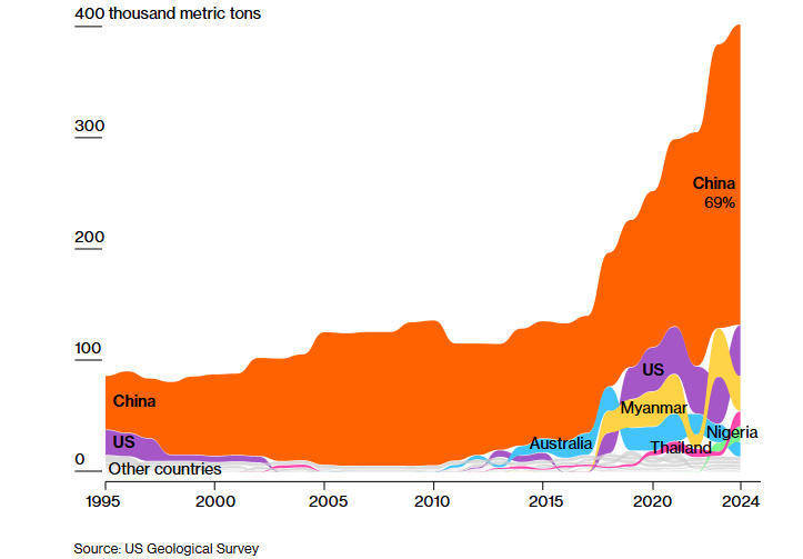 多项数据显示,中国在稀土开采生产中占据主导地位。彭博社制图