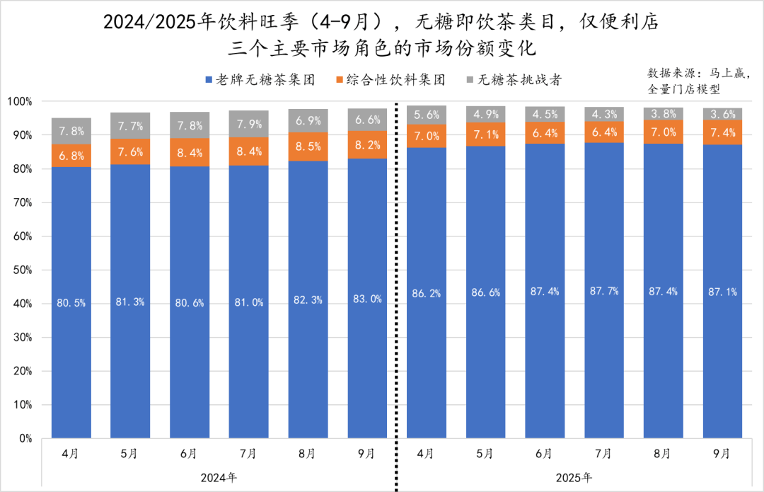 与此对应的则是渠道积累相对较薄弱、以便利店货架为核心起盘的无糖茶挑战者们,其在仅便利店业态中的市场份额,在2025年旺季开始的4月,还有5.6%(整体4.1%),但在2025旺季结束的9月,仅剩3.6%(整体3.4%)。