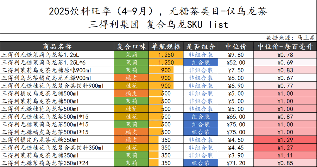 上文中,已经提及了部分无糖茶内乌龙茶种的占比、以及价格上的变化。整体来看,乌龙的占比在无糖茶类目中整体保持稳定,价格上则在2025年旺季相比2024年,有一定的件均价同比上升迹象。
