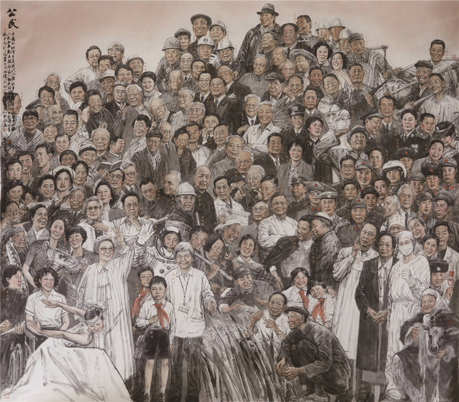 在国家大剧院艺术馆西厅,有一面展墙新挂出一幅顶天立地的中国画《公民》。这幅被创作者冯远定义为“歌颂遍地英雄、人间至情的画作”,用重墨轻彩勾画出新中国不同时期110多位杰出公民,如雷锋、焦裕禄、钱学森、袁隆平、吴仁宝、任长霞、王蒙、屠呦呦、樊锦诗……冯远把自己也画了进去,画在最远处、最角落处。这幅画既是他对“为时代造像”使命的践行,也是以画中人物为镜的自我砥砺。