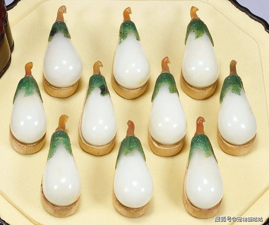 仿生造型的玉制鼻烟壶在十八世纪后尤为流行,宫廷造办处制作的数量明显增加。然而像这一套完整保存、配有原紫檀木盒的十件成组鼻烟壶,实属难得。可对比台北故宫所藏两套青白玉茄式鼻烟壶,其配置与此套作品极为相近。