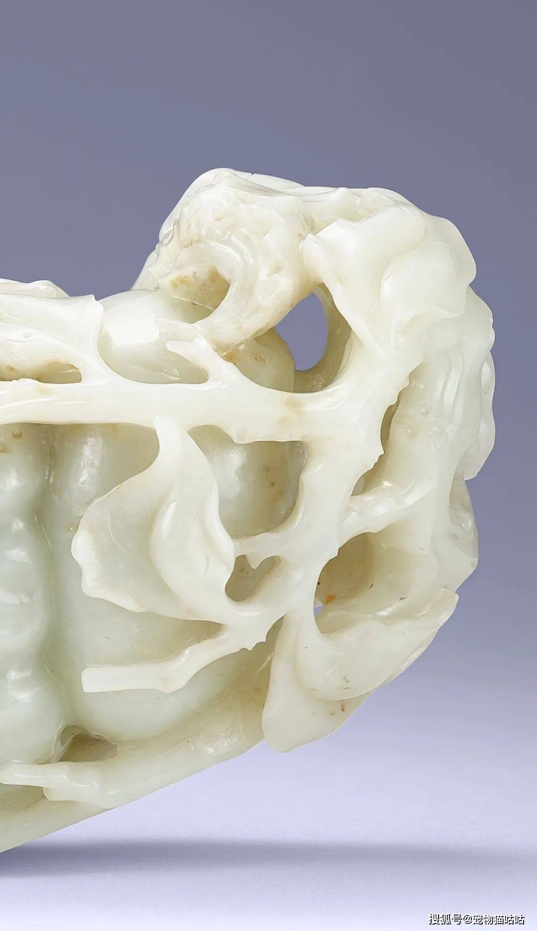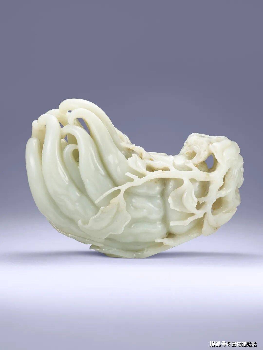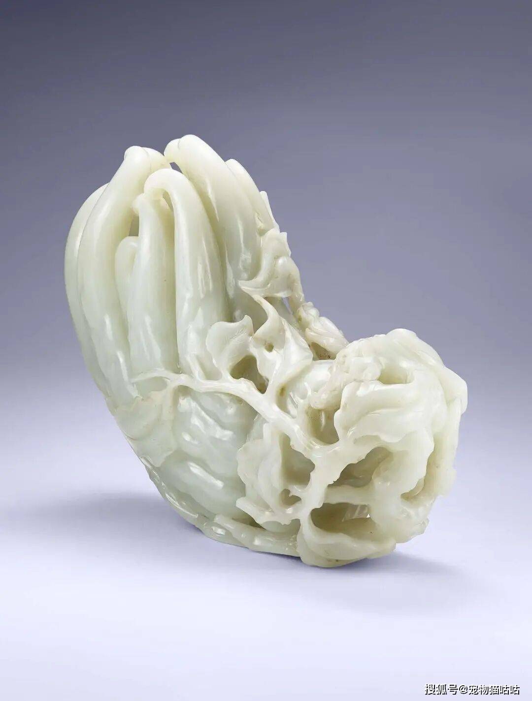 佛手果形饱满,指节分明,细节处转折精微,既有写实的生趣,也不失文人赏玩的意趣。更难得的是其体量硕大,较一般公私收藏的同类作品更为壮观。台北故宫亦藏有一件青白玉佛手,尺寸较之略小。