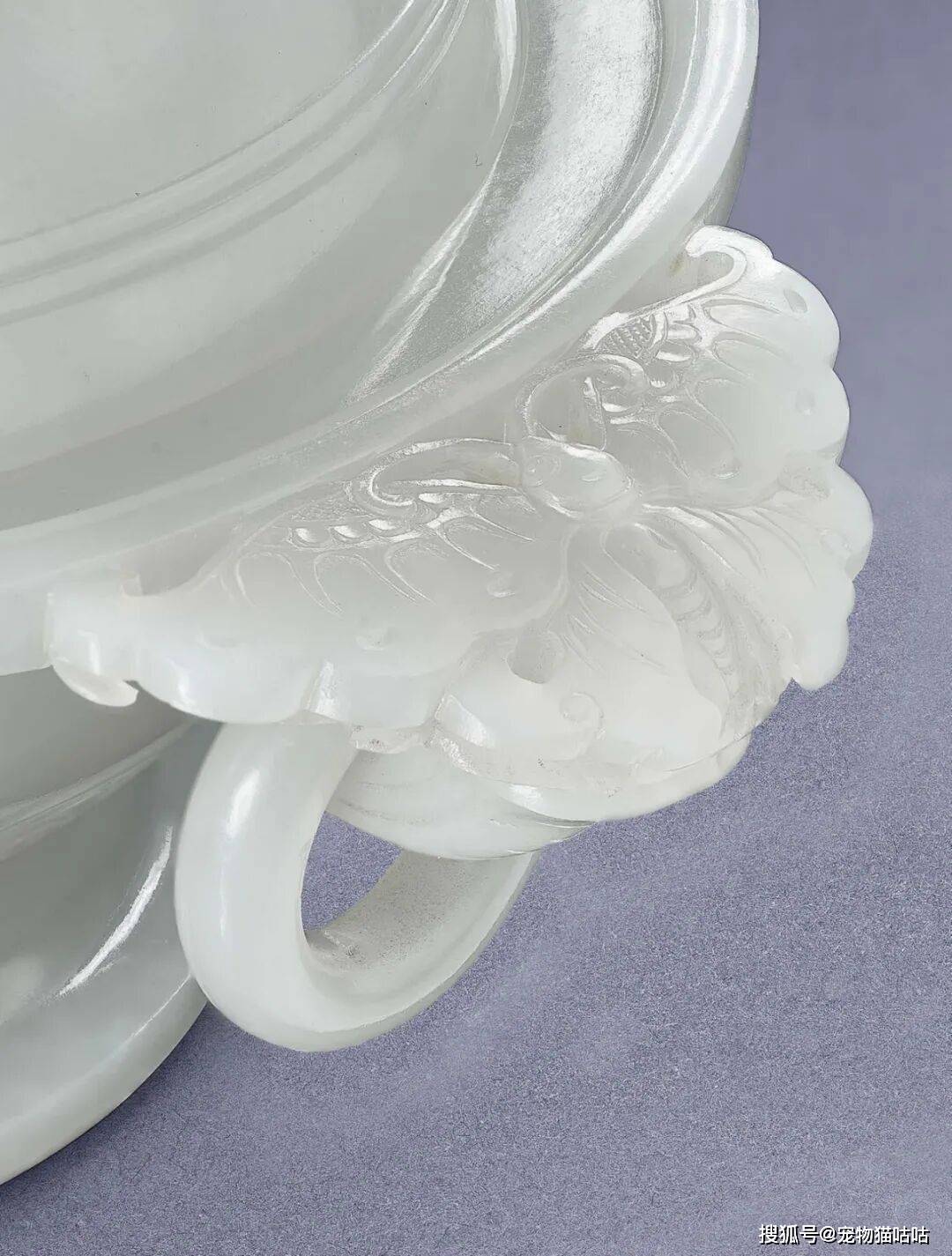 遍观现存公私收藏,尚未见与此器形制、纹饰完全相同的例子,或为孤品。可参考北京故宫所藏一件青白玉八宝蝴蝶活环耳盖炉,口沿对称饰四蝴蝶耳,造型相近,推测或出自同一工匠之手。