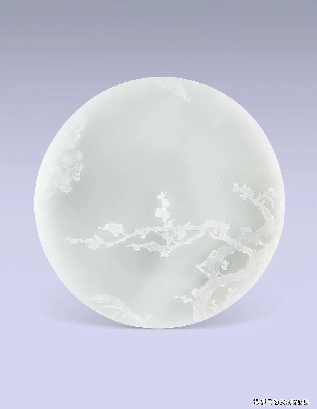 玉质青白通透,色泽莹润纯净。圆屏两面两面皆以多层浮雕刻成,一面雕寿老与童子行于层峦叠嶂之间,苍松葱郁连绵,雕功精湛,甚至有景深效果。另一面则雕松、竹、梅三景,寓意「岁寒三友」,构图灵秀,意境空灵。
