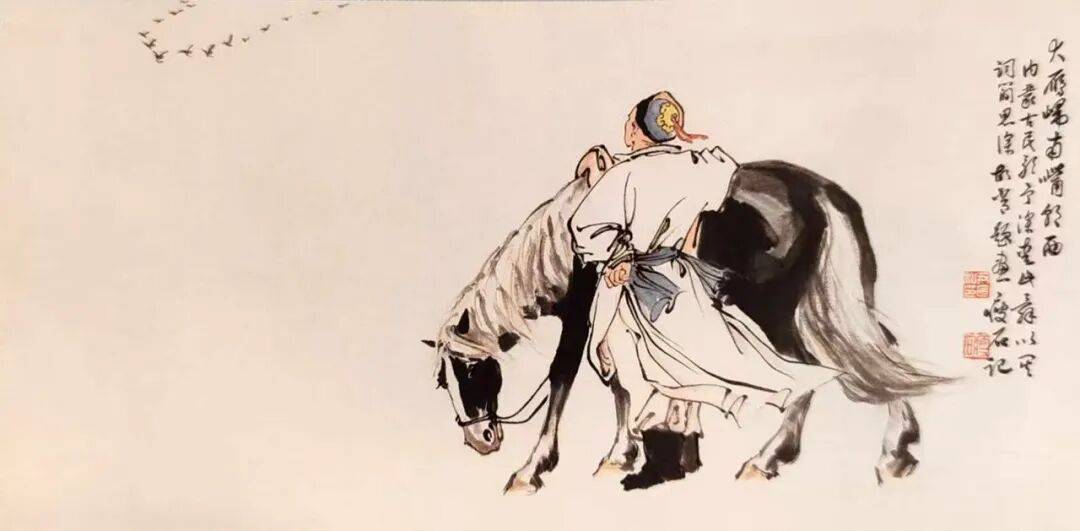款识:大雁归南嘴朝西。内蒙古民歌,予深爱此辞,以其词简思深,故常题画。瘦石记。