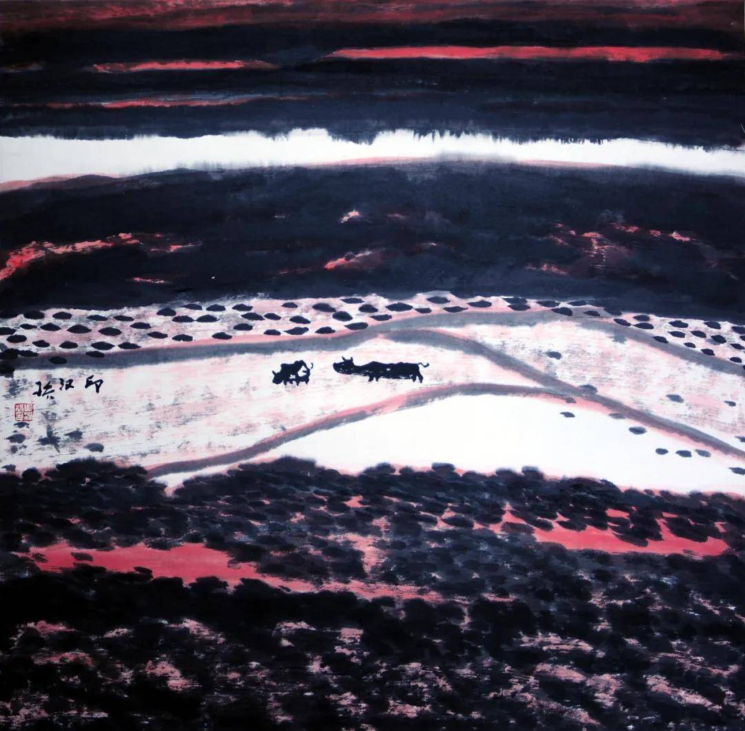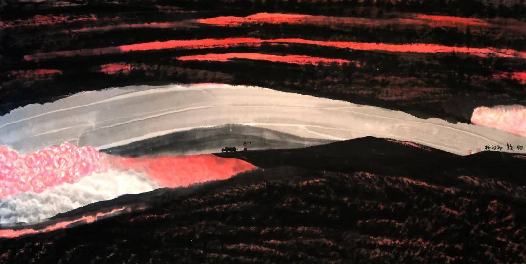 色彩是邱汉桥艺术的又一突出特色。他不仅继承了传统中国画的墨色体系,更创造性地拓展了色彩的表现力。在他的调色盘上,既有传统水墨的典雅含蓄,又有现代色彩的丰富表现。他尤其擅长运用红色与黑色的对比与融合,创造出既传统又现代的独特视觉体验。这种色彩语言既有个人的情感温度,又有东方的哲学深度。