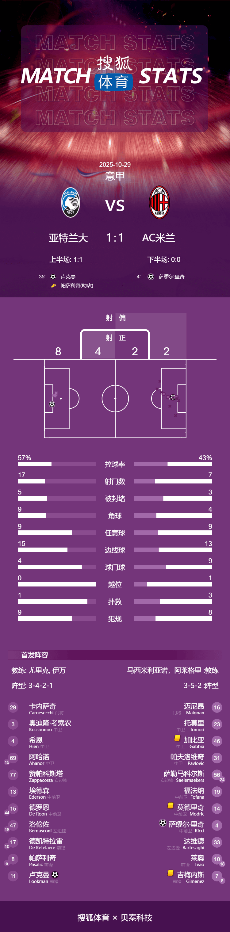 北京时间2025年10月29日凌晨3:45,意甲第9轮,亚特兰大主场迎战AC米兰。上半场,萨缪尔·里奇为AC米兰先拔头筹,随后卢克曼为亚特兰大扳平比分。下半场双方均未能改写比分,比赛以1-1平局收场。此役过后,AC米兰积18分落后榜首的那不勒斯3分,亚特兰大则积13分。
