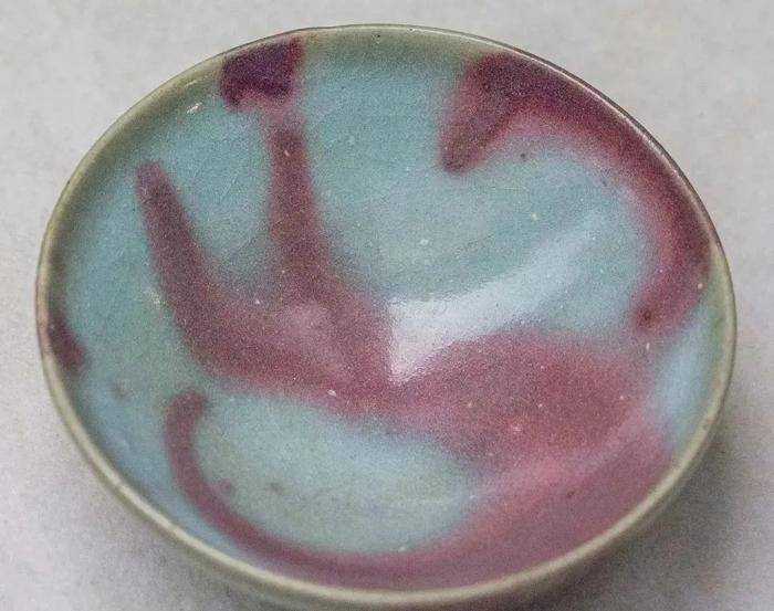 钧窑红斑是釉中含铜所出现的,红斑和其他釉色交接处有一过渡的是宋代的。元代的过渡差一些。有蚯蚓走泥纹,有蟹甲绿,足有满釉的少,胎质有泥质成为宋产。砂质的为元代的。应该说,钧瓷和景德镇瓷用的高岭土瓷胎是有区别的,和其他窑口用料也不一样。