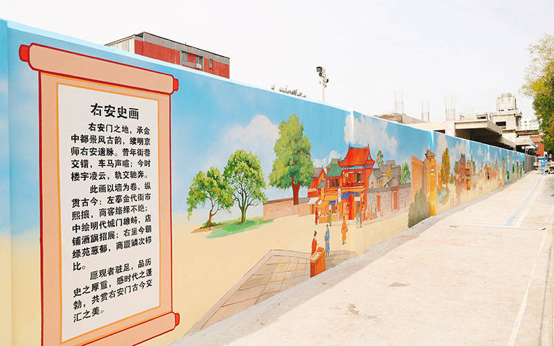 《右安史画》由丰台区右安门街道办事处组织创作,这幅 55 米长的彩绘墙以右安门城门为视觉中轴,左侧铺展金中都与明京城的繁华市井,景风门、中都水关、右安门等历史地标错落点缀;右侧则勾勒右安门街道的现代化风貌,中国出版集团、北京南站、京印国际中心、西铁营万达等当代地标鲜活呈现。作品通过精妙的构图设计与视觉引导,让古路与今道在城门处自然交汇、时空叠合,营造出 “一步跨千年”的沉浸式穿越体验。