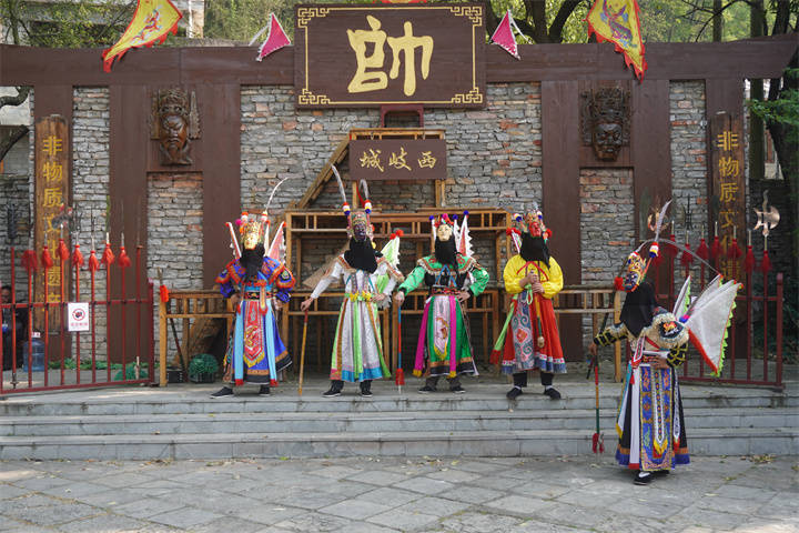 屯堡妇女身着宝蓝色的“凤阳汉装”,头饰、翘头绣花鞋依然保持着明初江淮的典型样式,她们是“行走的明代服饰博物馆”。更为震撼的是被誉为“中国戏剧活化石”的安顺地戏。表演者头顶色彩浓烈的木刻面具,在锣鼓声中演绎《三国》《杨家将》等英雄史诗,其高亢的唱腔和豪迈的舞步,保留了古代军傩的遗风,是屯堡人忠勇精神的生动传承。