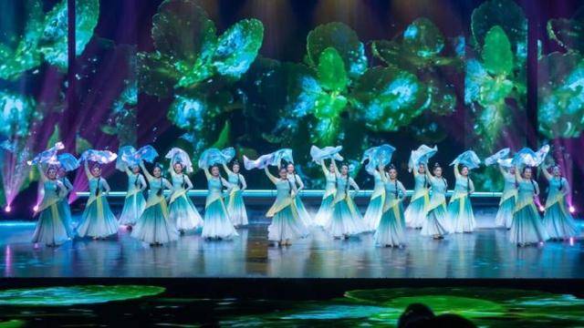 舞蹈《雨步·心路》中,绿色斗笠像一片片生机盎然的荷叶,舞步如蜻蜓点水,漾起温柔的涟漪,“雨步”之下,是更为深沉的“心路”,表达着老同志们用汗水和坚韧,铸就着家乡蓬勃发展的道路。