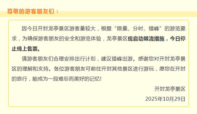 记者从开封龙亭景区获悉,因今日景区游客量已达较大规模,为严格落实“限量、分时、错峰”游览要求,保障广大游客的游览安全与体验,景区现已启动限流措施,今日线上售票通道同步关闭。