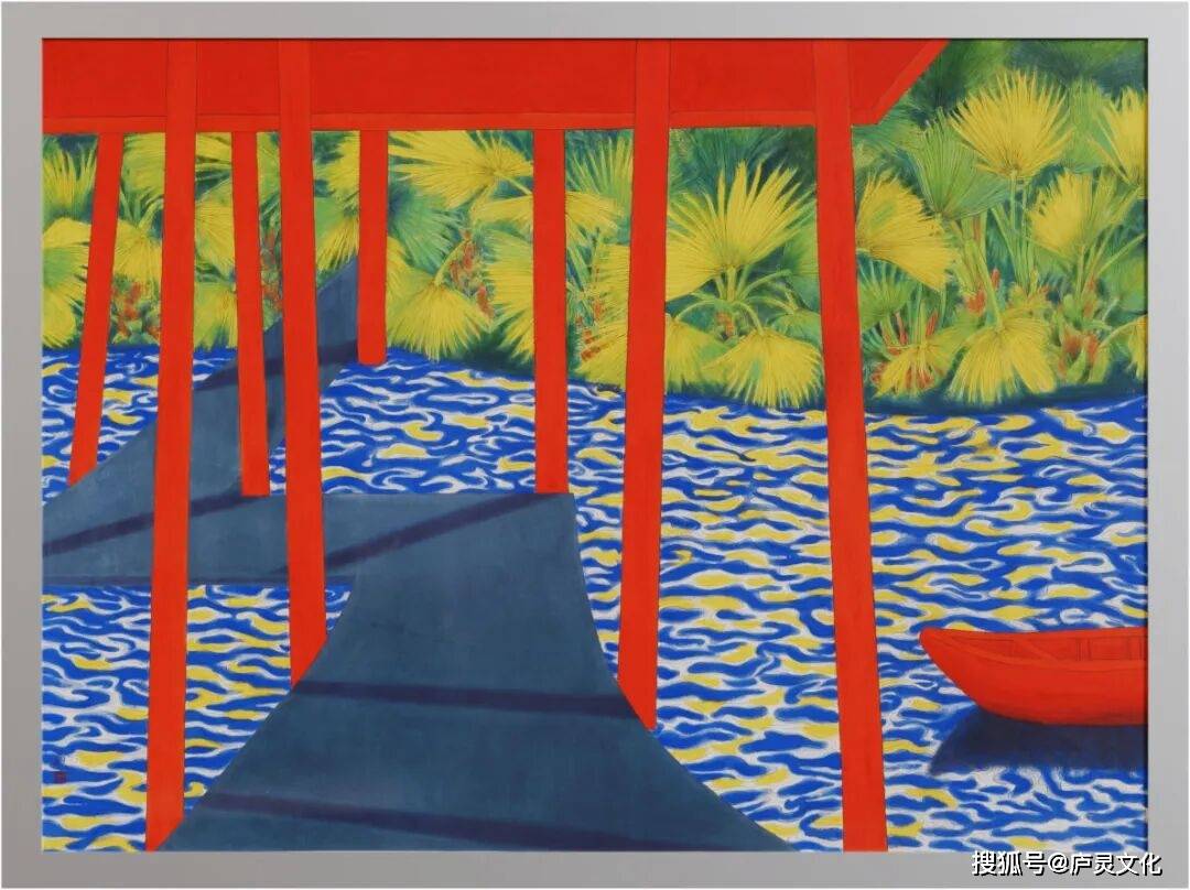 这幅作品展现出一处富有诗意的水边景致。画面中红色的亭柱与小船十分醒目,与蓝黄相间、带有波纹的水面形成鲜明的色彩对比,中景翠绿带黄的棕榈色彩明快且层次丰富,亭下的步道延伸向远方,营造出一种静谧又充满生机的氛围,仿佛将观者带入一个兼具自然意趣与人文气息的空间,传递出独特的视觉美感与悠然意境。