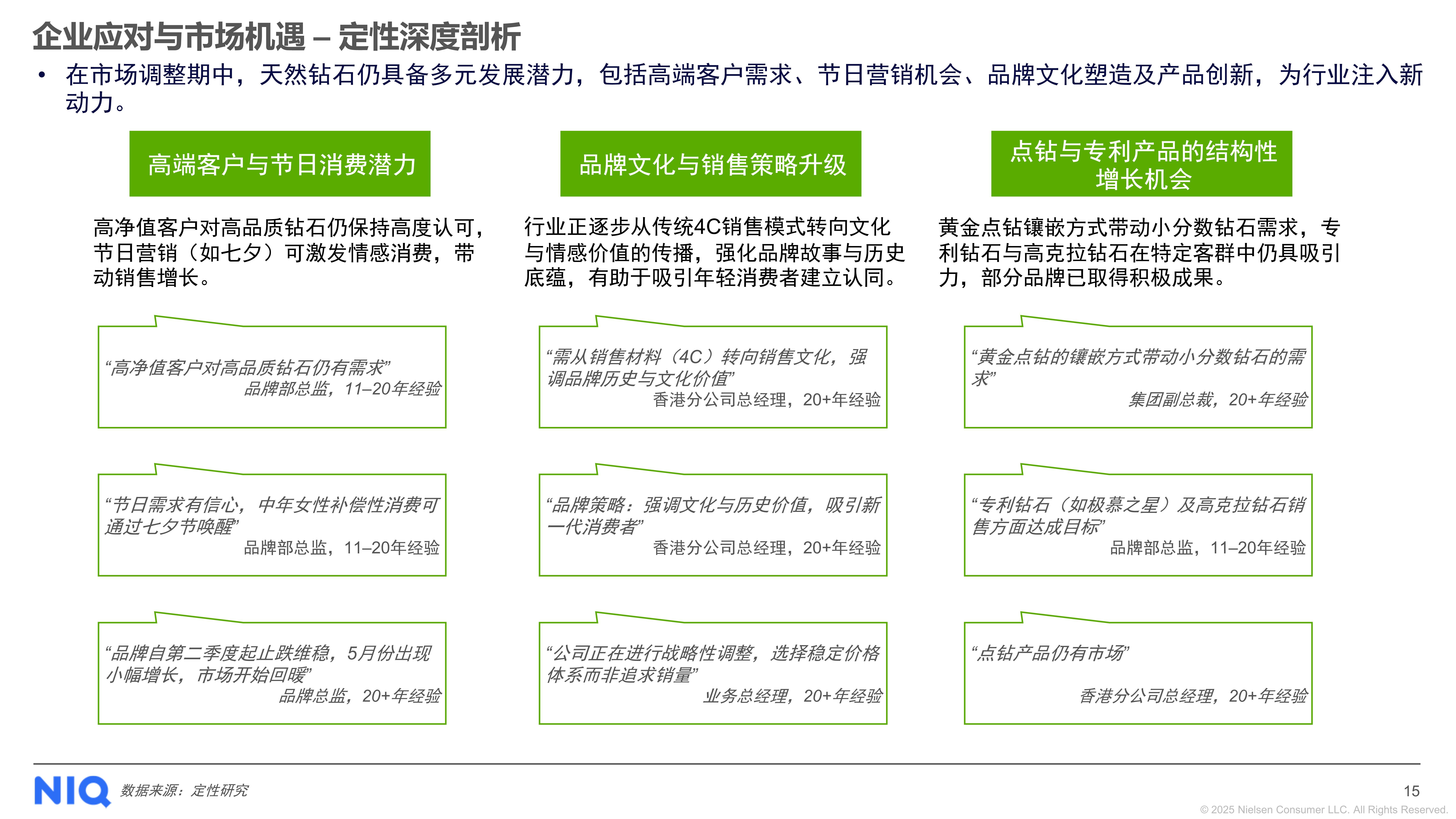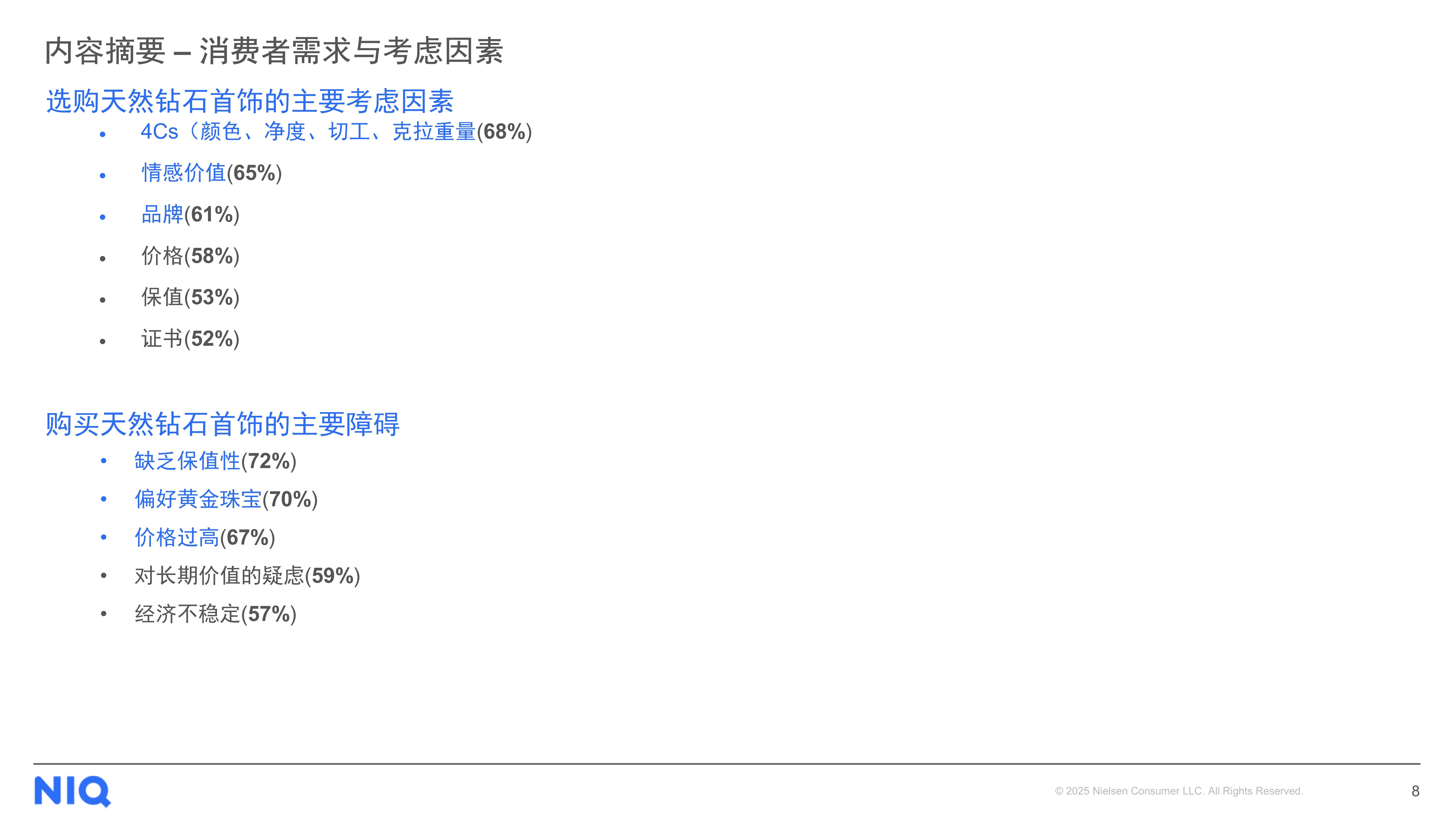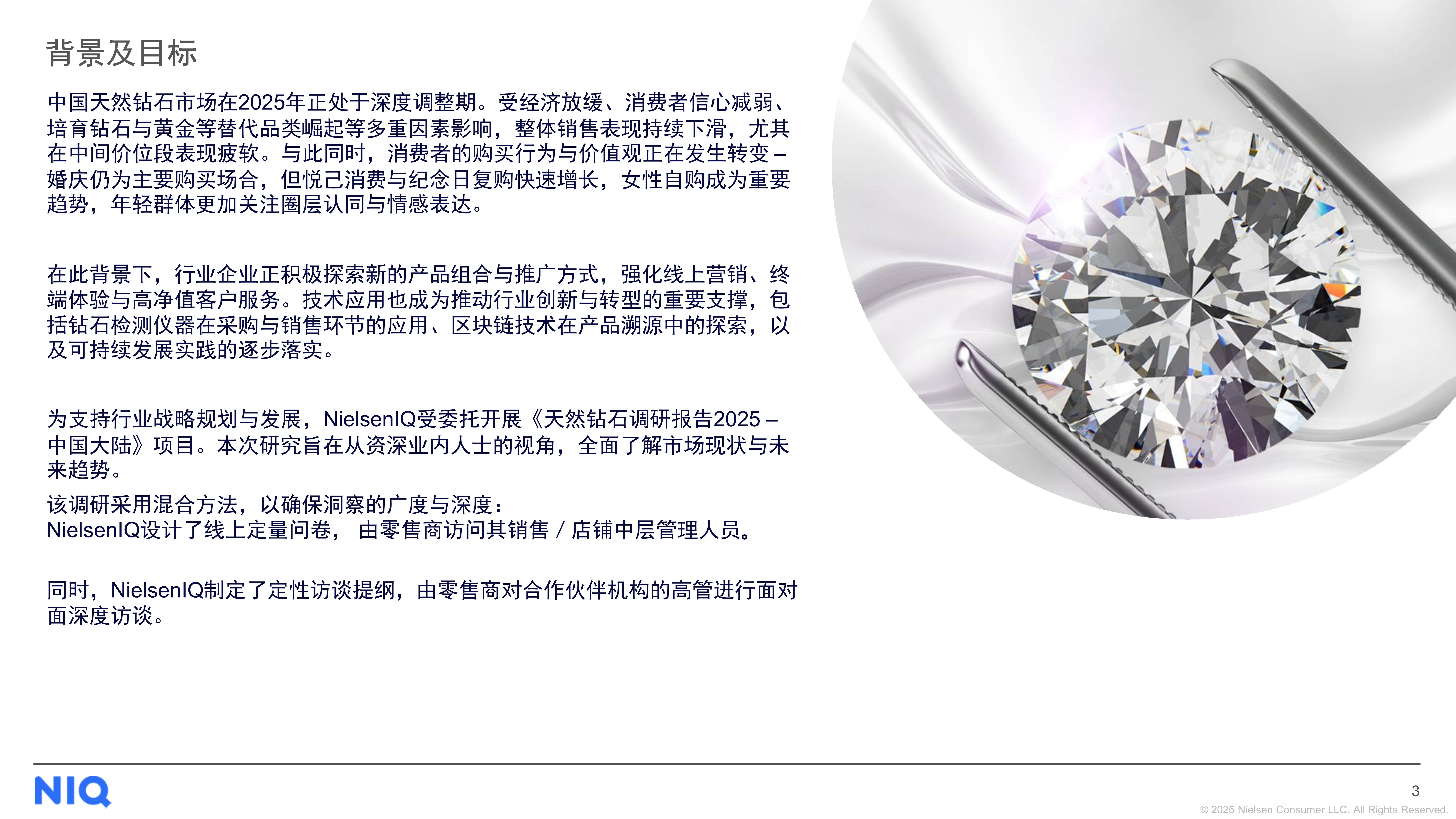 2025年中国天然钻石市场处于深度调整期,受经济放缓、消费者信心减弱及替代品类崛起等因素影响,整体销售下滑。消费者购买行为和价值观发生转变,婚庆仍是主要购买场合,但悦己消费和纪念日复购增长迅速。行业企业正通过强化线上营销、终端体验和高净值客户服务来应对挑战。