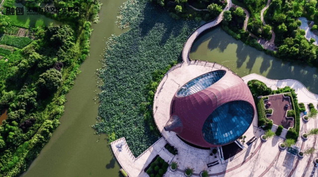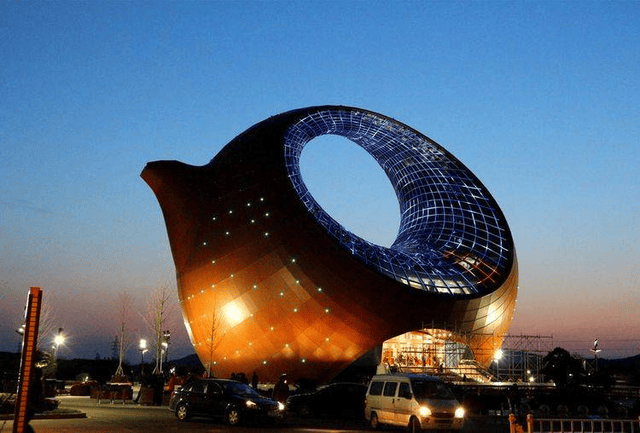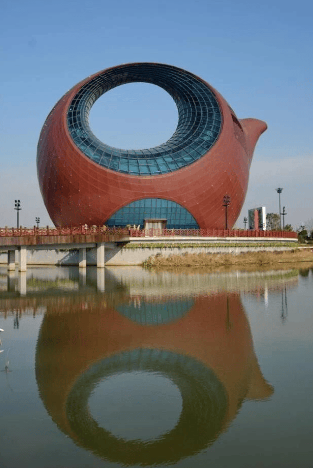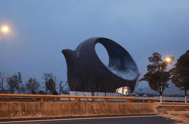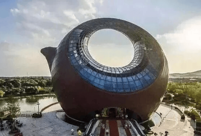 整个建筑耗资1.5亿元打造,高度接近39米,直径约50米,外观灵感来自宜兴紫砂壶的经典器型,特别是汪寅仙大师的“神鸟出林壶”。